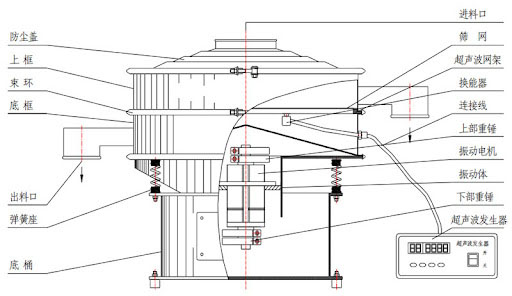 流通式超聲波篩由防塵蓋、進(jìn)料斗、超聲波振動(dòng)系統(tǒng)、篩網(wǎng)、出料口、減震底座、電機(jī)等組成。超聲波換能器均勻分布于篩網(wǎng)兩側(cè),通過高頻振動(dòng)快速破除物料粘連,搭配耐磨不銹鋼篩網(wǎng),實(shí)現(xiàn)精細(xì)分級(jí)。中間層設(shè)導(dǎo)流板引導(dǎo)物料流通,底部減震底座采用橡膠減震墊,減少運(yùn)行噪音與設(shè)備損耗。